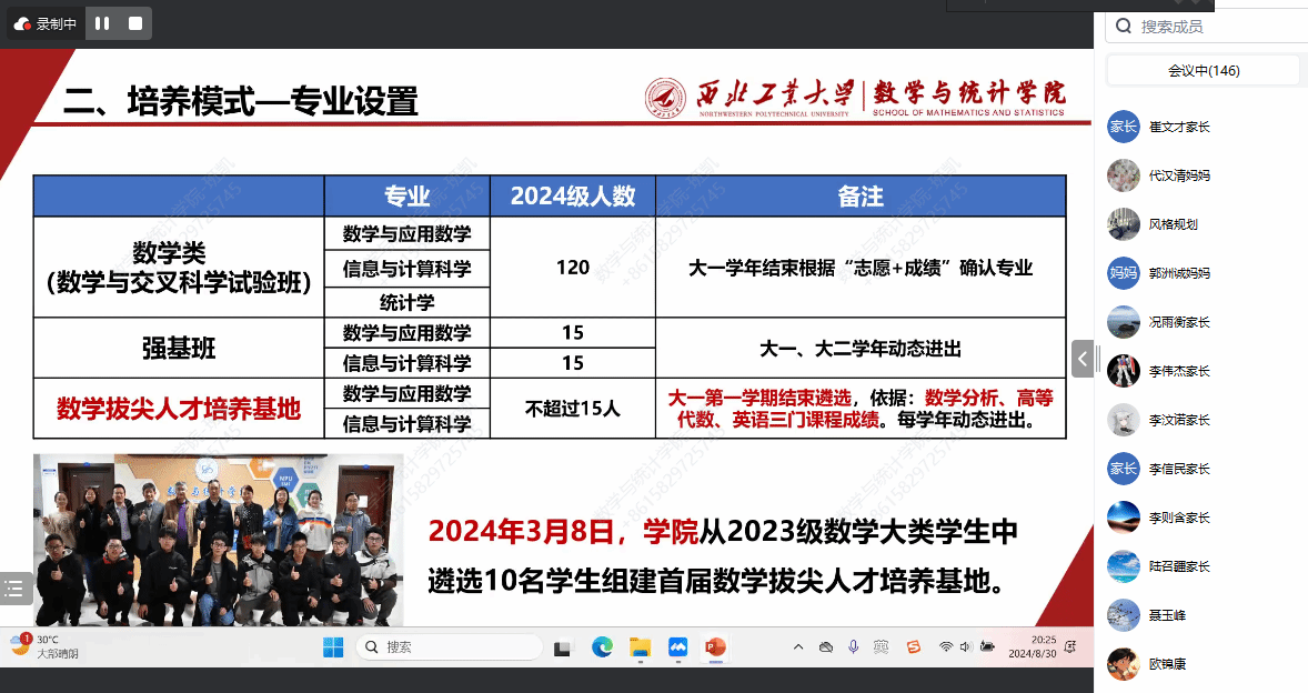 8月30日,学院领导班子成员与全体新生家长云端相聚。在这场别开生面的新生家长见面会上,学院整体情况介绍、本科人才培养工作亮点及成绩、家校联动合力育人等内容备受家长们的关注。院长聂玉峰、党委书记王莉、副院长郭千桥围绕主题依次发言,不仅进一步加深了新生家长们对学校、学院的印象和认同感,而且对把孩子交给西工大培养成才表示倍感放心。
