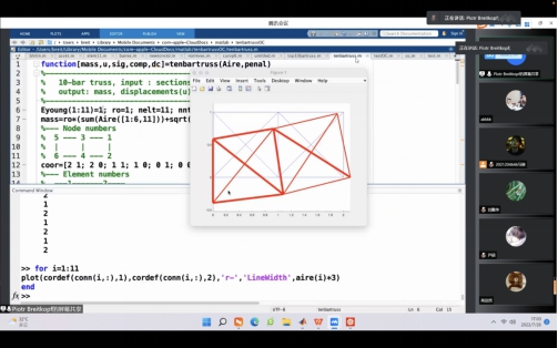 Piotr Breitkopf教授首先介绍了结构优化的基本概念,包括非结构网格、体素网格、KKT条件、离散系统分析等。其次是有限元方法的介绍,主要内容包括桁架有限元法、基于Matlab的桁架有限元分析、桁架拓扑优化设计流程、收敛准则等。