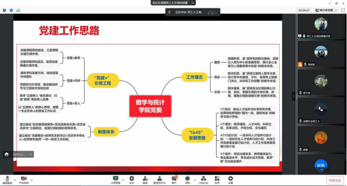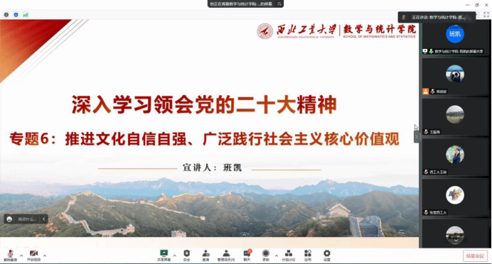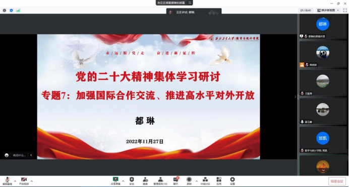 本次学习研讨的五个主题使中心组成员更加深入学习领会了党的二十大精神,数学与统计学院将坚定不移全面从严治党、深入推进新时代党的建设新的伟大工程,坚持立德树人根本任务,通过对于社会服务、文化自信、国际合作和防范化解风险挑战方面的专题学习,明确了要进一步加快学院发展,为学校“双一流”建设贡献力量。